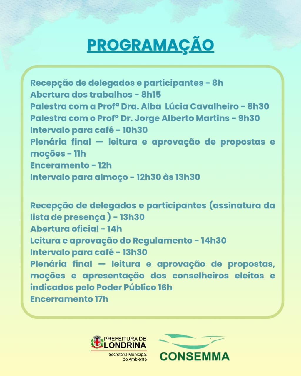 - Este ano, por questões operacionais, a Pré-Conferência e a XI Conferência Municipal do Meio Ambiente serão realizadas num único dia: será num sábado, 21 de maio, a partir das 8 da manhã até o final da tarde, no auditório da UniCesumar Londrina.