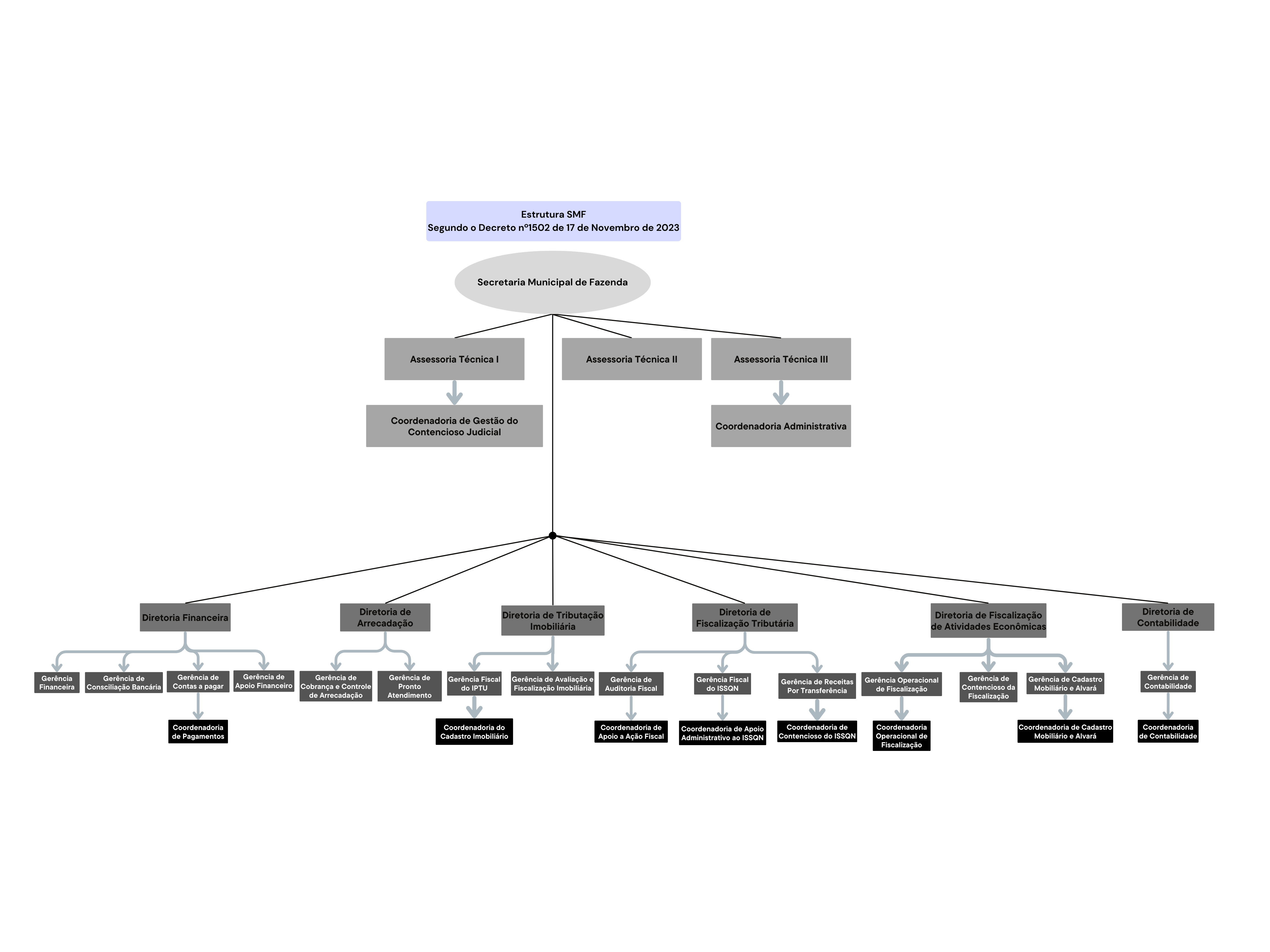 Através do Decreto nº 708, de 26/06/2013, foi alterado o inciso II do artigo 2º bem como os artigos 7º ao 11 e seus incisos do Decreto nº 1244 de 11/10/2012 – “Regimento Interno da Secretaria Municipal de Fazenda” revisando a estrutura da seguinte unidade organizacional: